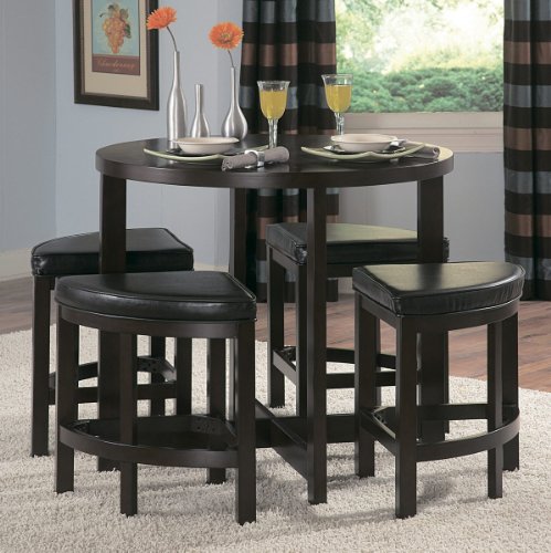 These pieces can be more practical for tall family members add an interesting height variation to furnishings and also appear take up less space visually making them ideal for smaller dining rooms open floor plan homes and eat in kitchens. Perfect for entertaining the table has a removable wine rack to keep extra bottles handy. This dining set includes a counter height table and four stools all crafted from eco friendly rubberwood and premium veneers. The display rows of the wine rack let one exhibit their collection of exquisite wines.